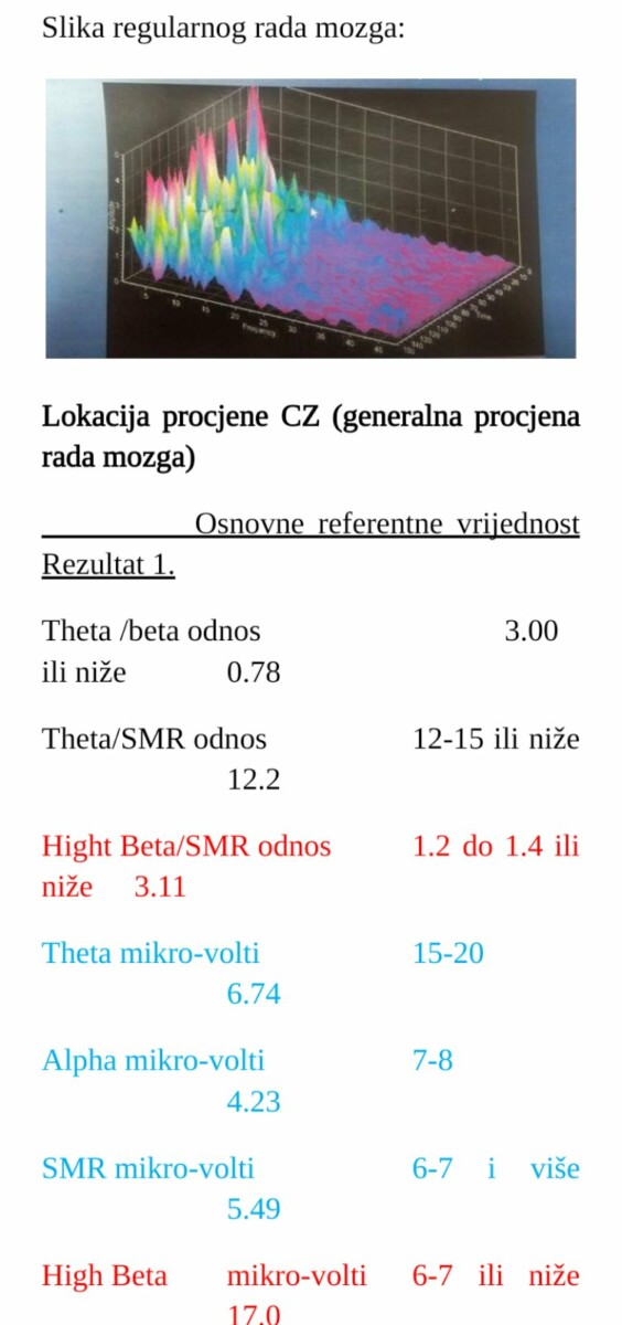 – Povećanje brzine rada mozga sa desne strane ukazuje na poteškoće kontrole emocija i hiperosjetljivost klijenta,, prenaglašenu senzoriku. Povećanje na lijevoj strani gdje je centar za govor nam ukazuje na poteškoće slušne obrade informacija. Naime, zbog značajno povećane brzine mozak jako brzo i plitko preleti preko informacija te ne uspije veliki broj informacija niti registrirati. Povećanje brzine na centralnom planu CZ nam ukazuje na poteškoće fokusa na ciljani zadatak, čestu izmjenu aktivnosti. Ono što je također zamijećeno jest šiljci theta valova vidljivi na 3D slikama. Svaki šiljak predstavlja jedno tzv.isključenje što nam ukazuje na poteškoće pažnje i koncentracije – navedano je u nalazu te savjetovano da se uradi bazična neurofeedbak terapija koja obuhvata 30 treninga kako bi se primarno smanjila brzina rada mozga te izregulisao rad theta valova kako bi se poboljšao fokus, pažnja, koncetracija te slušna obrada informacija.
