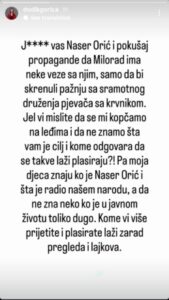 „J**** vas Naser Orić i pokušaj propagande da Milorad ima neke veze sa njim, samo da bi skrenuli pažnju sa sramotnog druženja pjevača sa krvnikom. Jel vi mislite da se mi kopčamo na leđima i da ne znamo šta vam je cilj i kome odgovara da se takve laži plasiraju?!“, napisala je ona.
