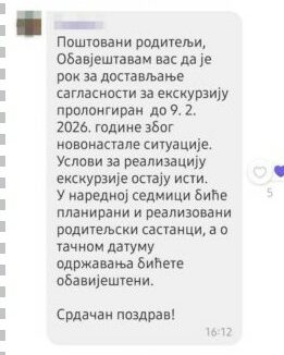 Istovremeno, djeca se preko nastavnika ucjenjuju da ukoliko se saglasnost ne potpiše do 9. februara, od ekskurzije neće biti ništa.